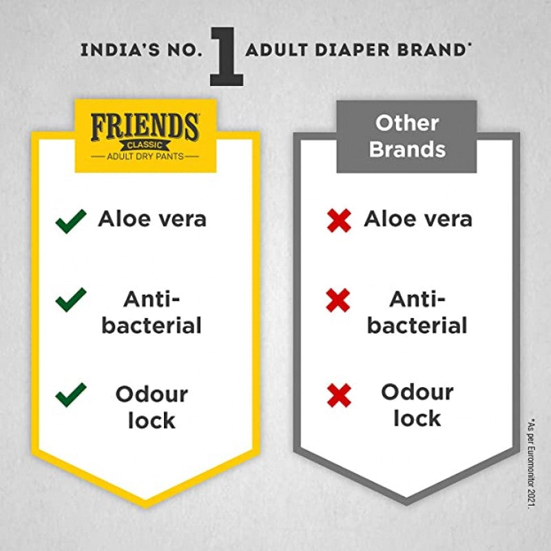 - Friends diaper pants are perfect for people with sensitive skin and are made with scientifically tested bacteria. They have 8 hours of protection from moisture and odour leakage and are dermatologically tested to prevent skin cancer. Whether you're in the shower, or changing after natural or contaminated products, It will keep you safe. So don't worry about coming up with a new protection routine - just buy these!