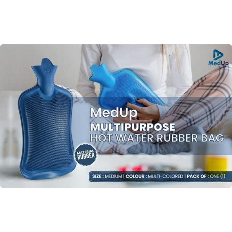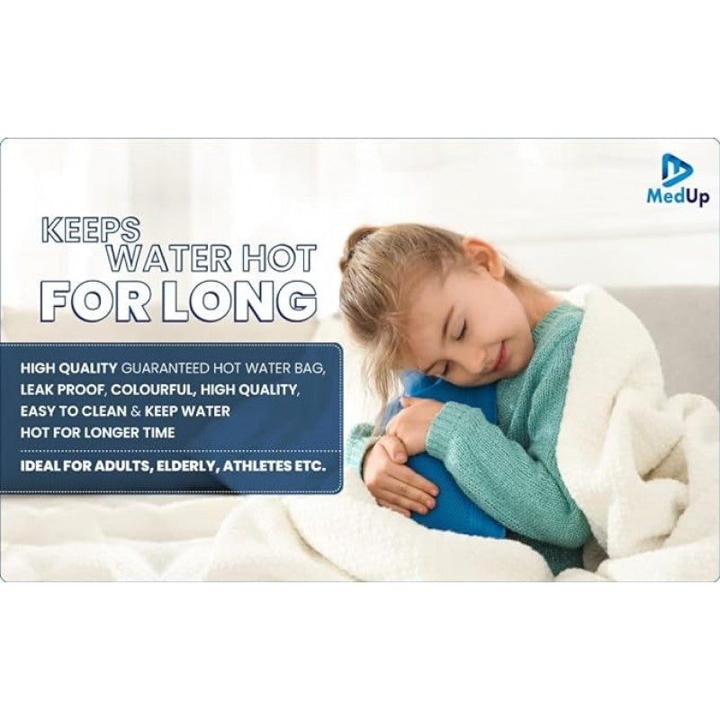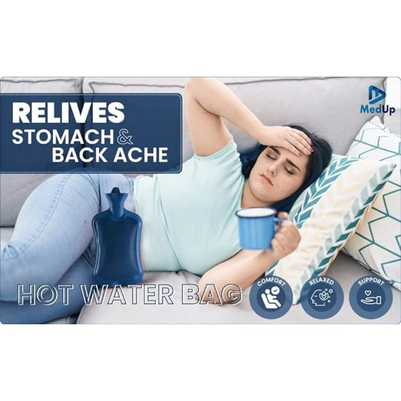 Experience reliable and durable pain relief with the MedUp Hot Water Bottle. Crafted from high-quality rubber, this hot water bottle comfortably withstands pressure, ensuring a leakage-free solution unlike other unreliable water bags. Designed for long-lasting heat, it provides extended relief from pain and discomfort. Target specific areas with its specialized design, offering versatile relief for muscular pain, stress, joint pains, cramps, menstrual pains, stomach aches, and backaches. Simple and clear instructions make it easy to use—fill with warm water, expel air, tighten the cap, and enjoy soothing relief on your shoulder, stomach, or back. The MedUp Hot Water Bottle is your versatile companion for reliable and targeted pain relief.